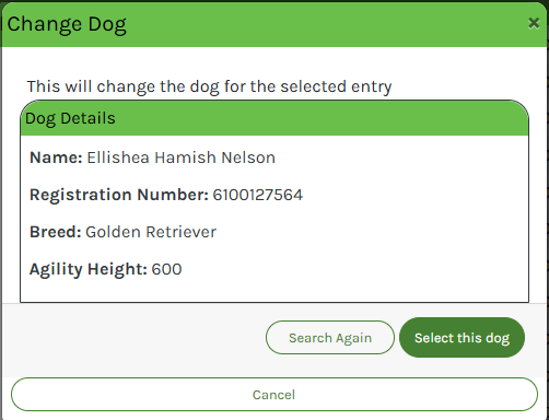 Confirm the dog details and click "Select this dog", or search again if it's incorrect